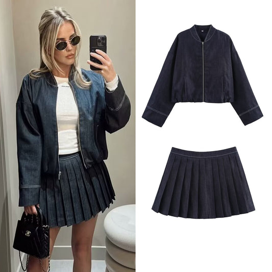 Denim Pilot Jacket Wide Pleated Denim Skirted Leggings