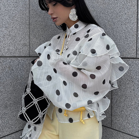 Elegant Ruffled Lace-up Stand Collar Polka Dot Shirt