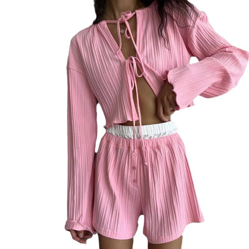 Vertical stripes create a lengthened, structured silhouette, elevating the softness with subtle intention. Crafted in smooth polyester knit, the set offers warmth without weight—perfect for transitional moments, remote workdays, and slow living done beautifully.