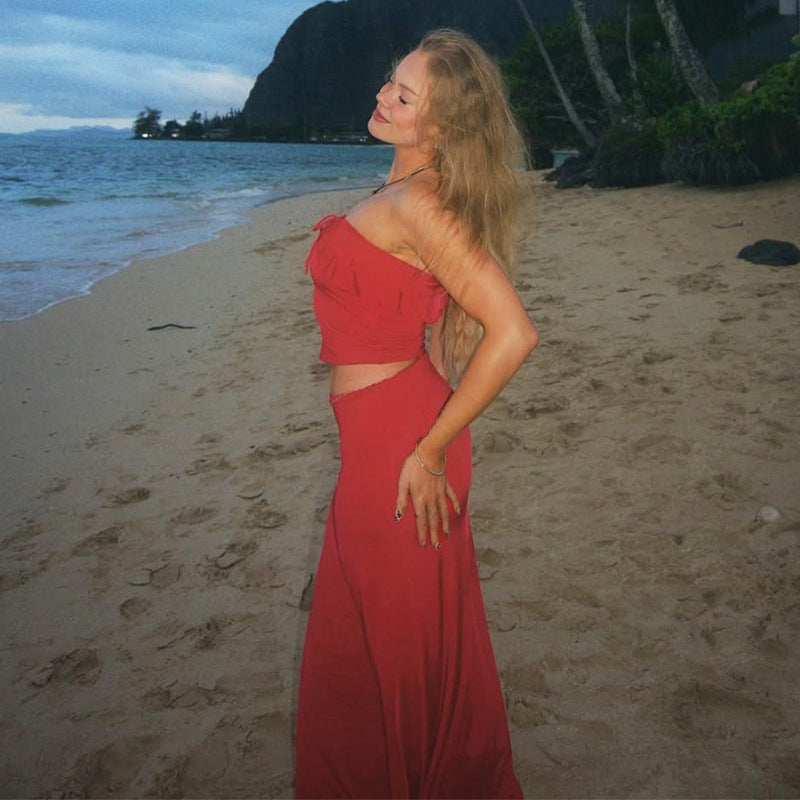 Summer New Elegant Wooden Ear Tube Top Package Hip Long Skirt Two-piece Set