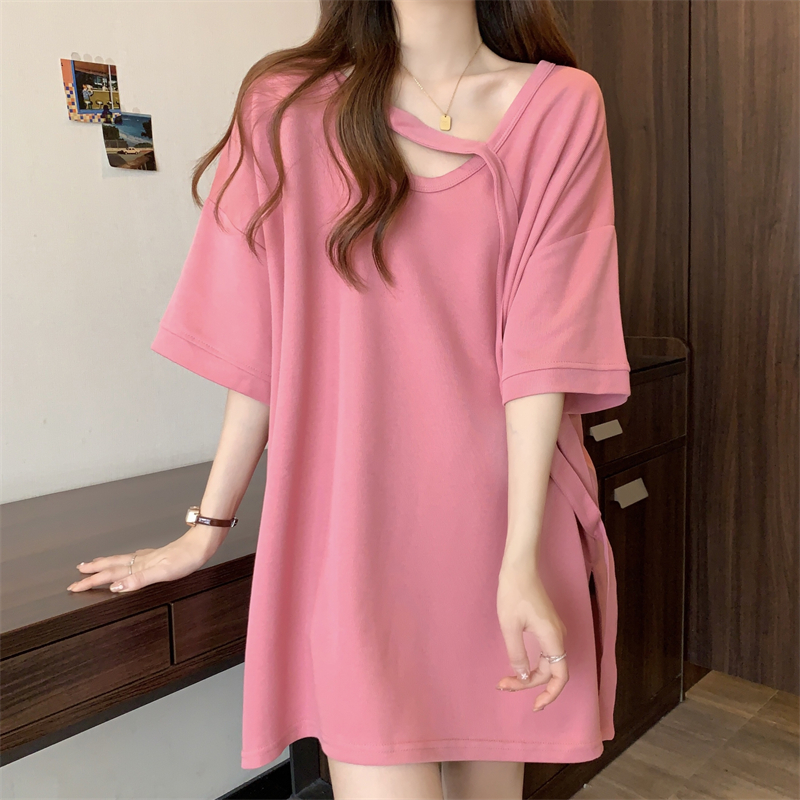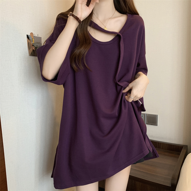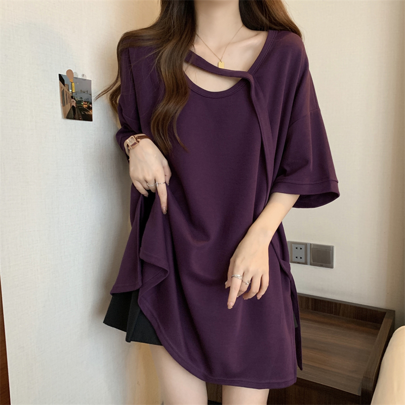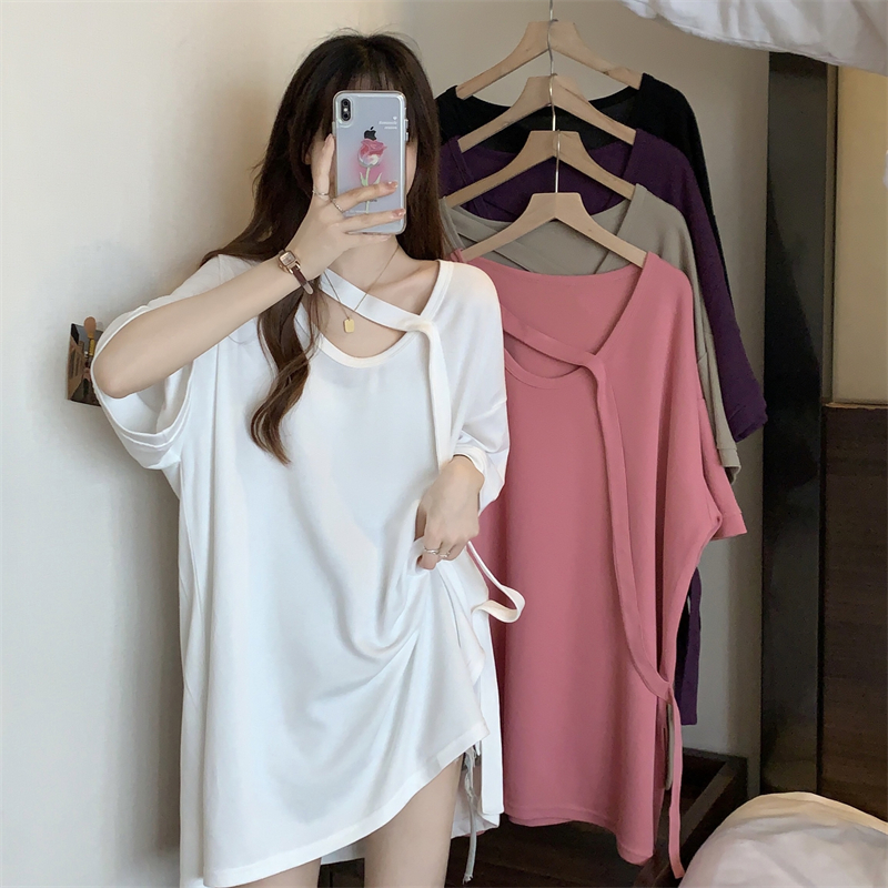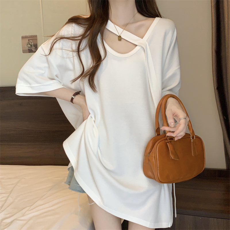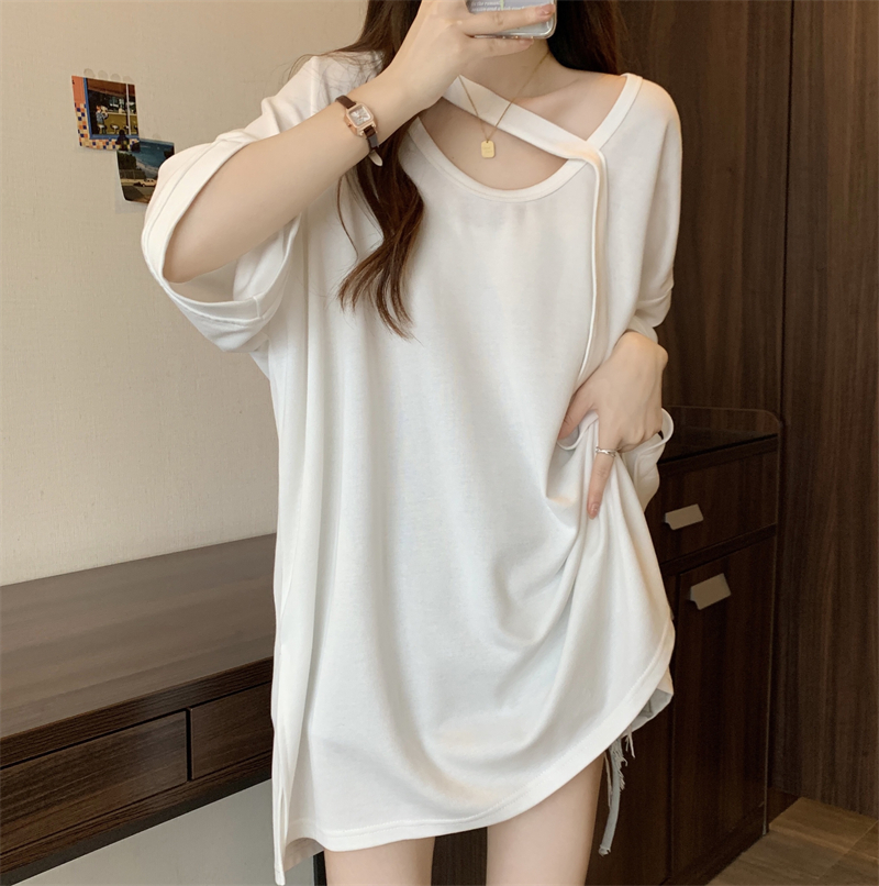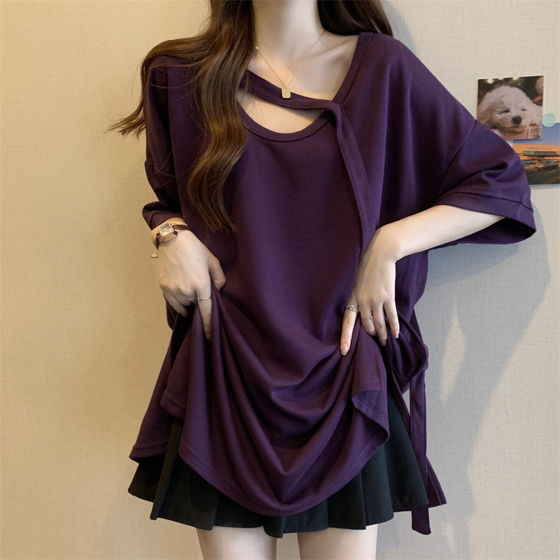 FlowFit: Luxe Asymmetry Plus Size T-Shirt: Plus size women's summer mid-length short-sleeved T-shirt covering the buttocks fat girl covering the belly to show thin shoulder half-sleeved top