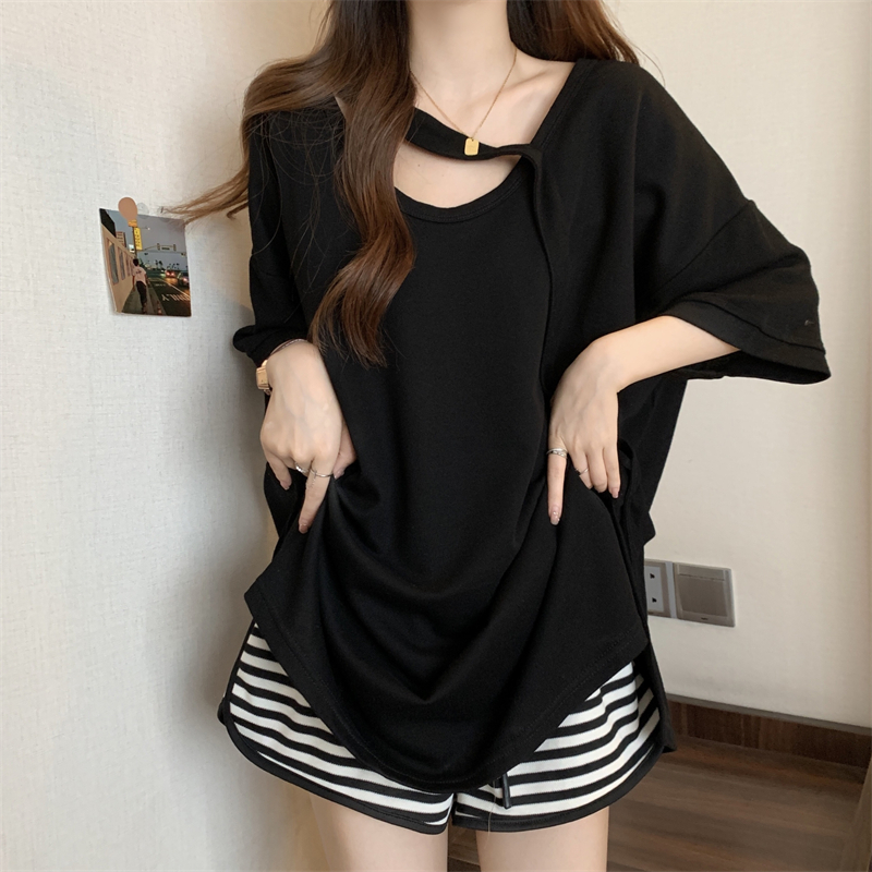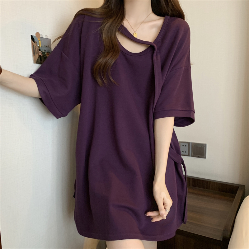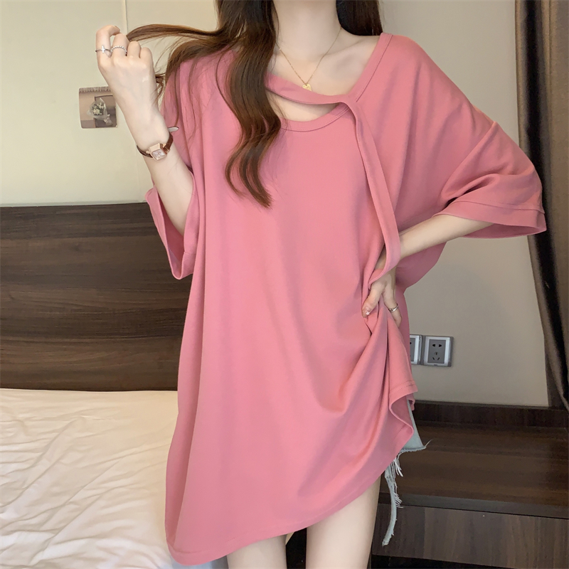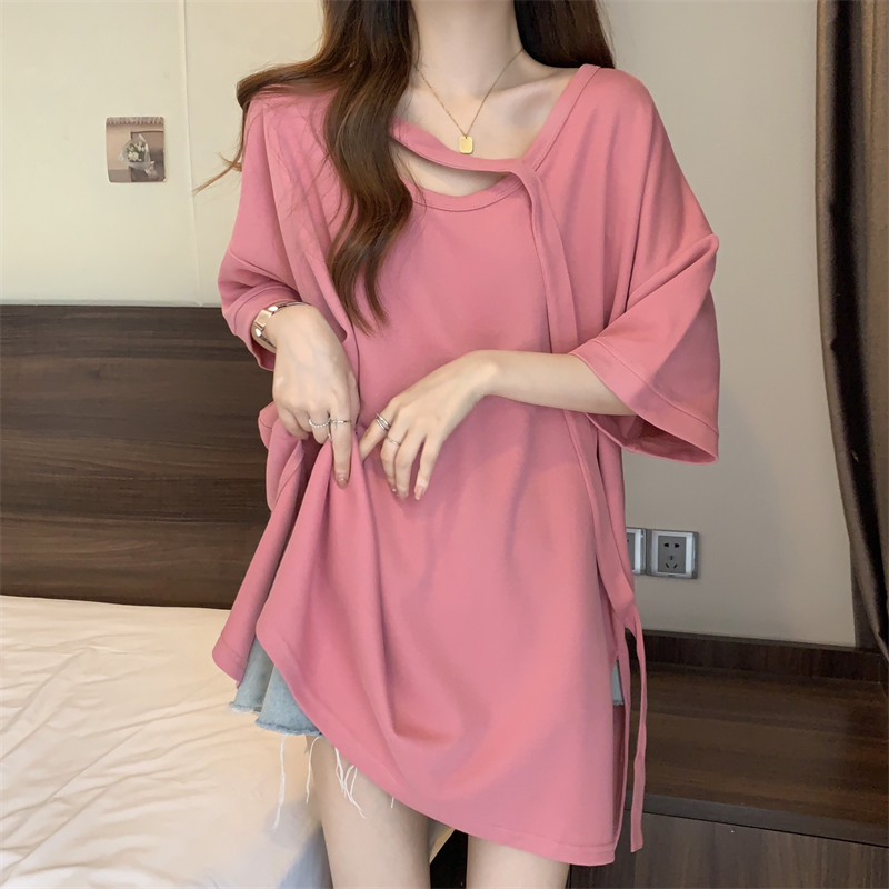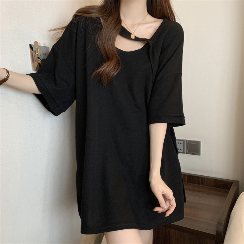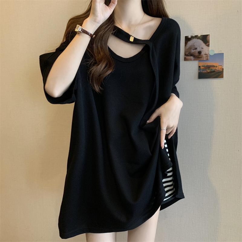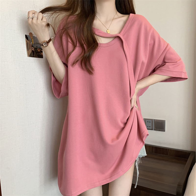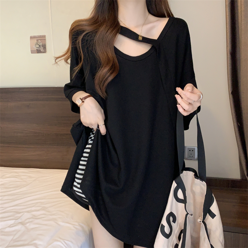 FlowFit: Luxe Asymmetry Plus Size T-Shirt: Plus size women's summer mid-length short-sleeved T-shirt covering the buttocks fat girl covering the belly to show thin shoulder half-sleeved top